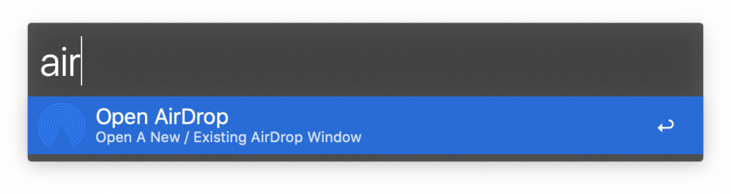 This workflow allows you to invoke AirDrop in Alfred by typing airdrop.