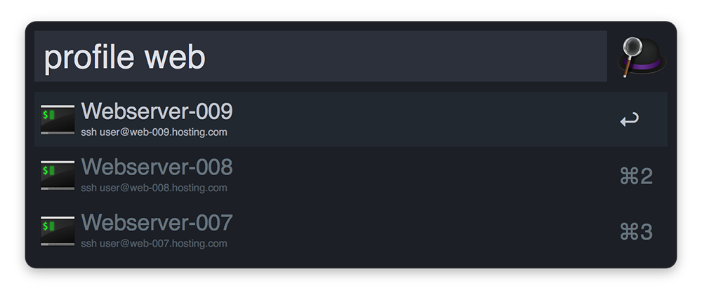 Search through your iTerm profiles using Alfred and easily open one. Extremely useful if you have a lot of profiles, e.g. with an SSH command for each server.