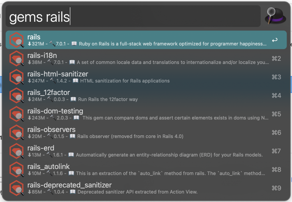 gems <gem name>-- search for all gems with a similar name. Press return/enter on any gem on the list to open it's RubyGems page in your browser. -
