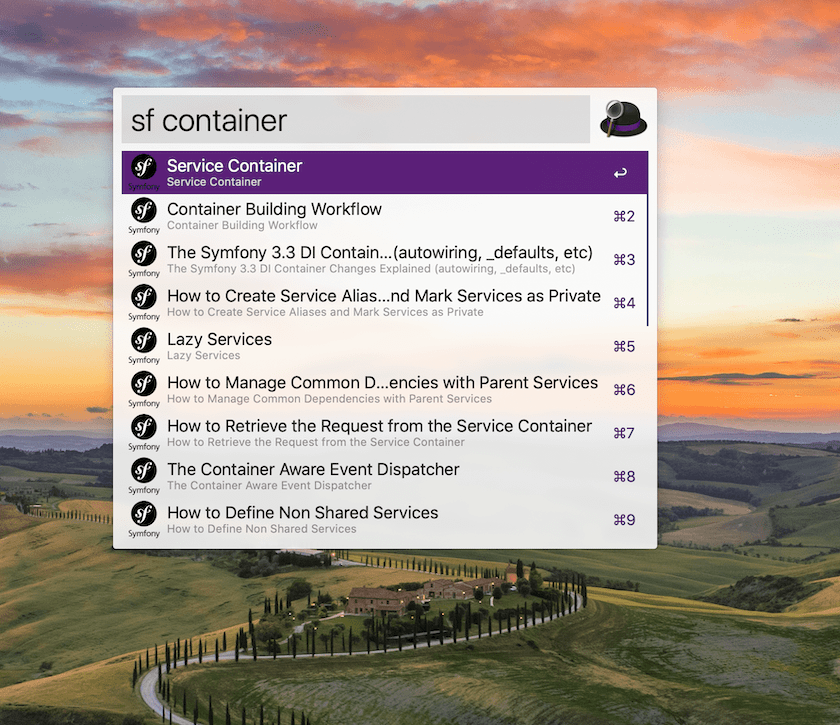 Download the latest version: https://github.com/ThomasTr/Alfred-Symfony-Docs/releases Install the workflow by double-clicking the .alfredworkflow file You can add the workflow to a category, then click "Import" to finish importing. You'll now see the workflow listed in the left sidebar of your Workflows preferences pane.