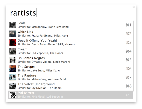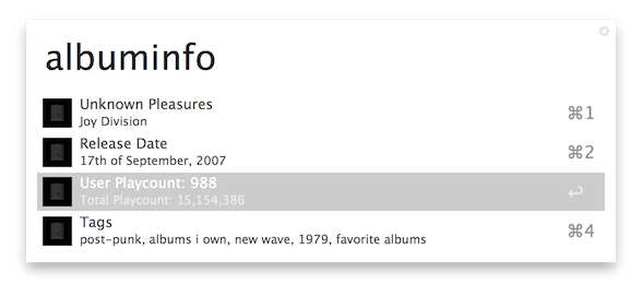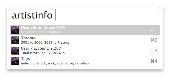 This workflow was created to easily enable the user to perform several actions with the last.fm interface without needing to access the web interface or the desktop application: only with Alfred!