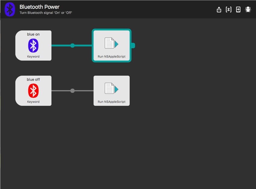 Alfred 3 workflow to turn Bluetooth signal 'On' or 'Off.' Keyword is 'blue on' and 'blue off.'