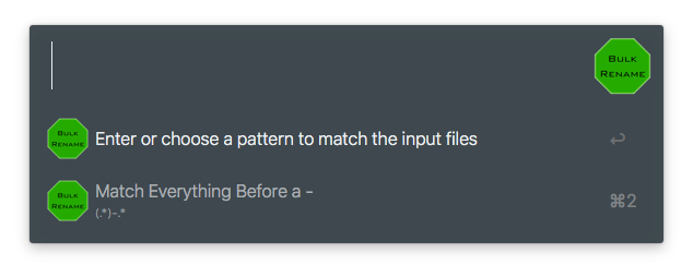 This workflow lets you rename multiple files at once via a file action. Therefore the workflow asks you for a matching pattern first and for a replace pattern after that. Alfred provides you with some useful predefined options. After defining both patterns you'll see a preview of the renaming result.