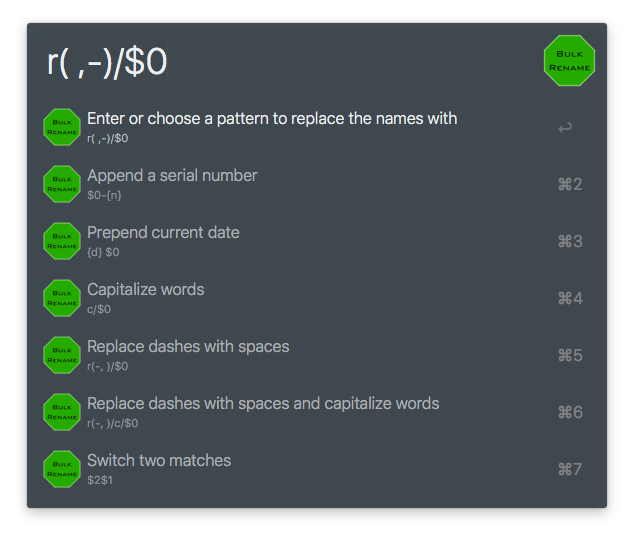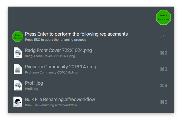 - After pressing enter again, Alfred shows you a list which gives you a preview of how the renaming will look.