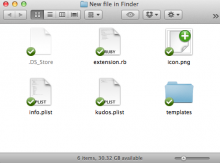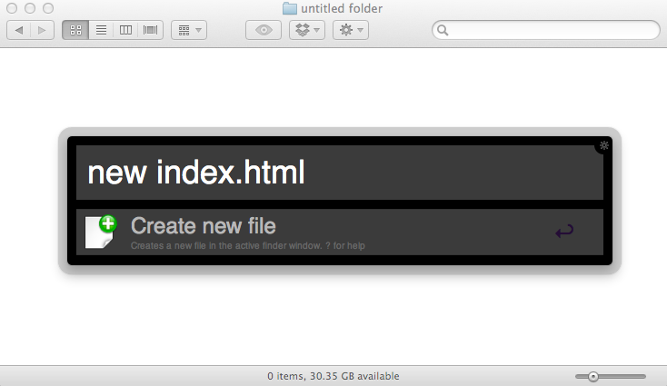 Simply load the folder you would like the new file to appear in, in the Finder. Then call up Alfred, and type “new “. You can now enter a new filename to be used for your new file. E.g. “index.html”. Your new file will be created in the folder for you instantly.