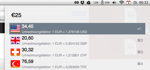 Write "$20.5" or "€ 35,27" and you get some currencies calculated by the current exchange rate. The exchange rate will be updated very often and will be cached. If you have no internet connection the last update will be used.