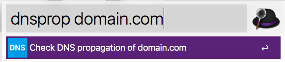 I just prepared very simple workflow to check DNS propagation time. It's helpful when redirecting domains and checking if DNS propagated yet. At this moment it's using www.whatsmydns.net but I may consider expanding it to show it in the Alfred directly.