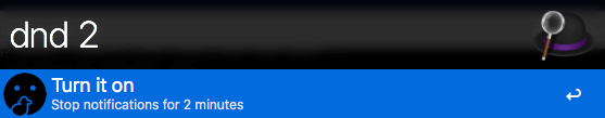 This workflow toggles the Do Not Disturb feature of macOS, optionally for a given length of time. It was inspired by CalmNotifications, but allowing for automatically toggling back after a time period as well as using a different method to toggle so that the status indicator (dimming of the notification icon) works correctly.