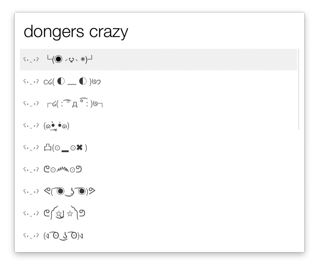 Alfred workflow to quickly browse through dongers (໒( ” •̀ ᗜ •́ ” )७ for example) via dongerlist.com.