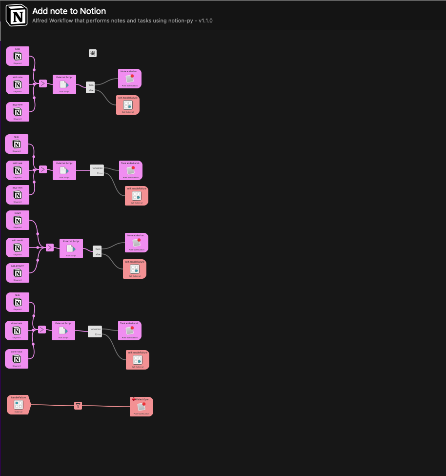 This workflow allows you to send quick thoughts to your Notion page or table via Alfred.
