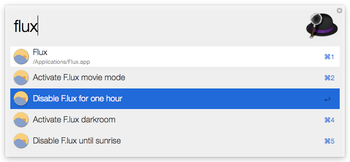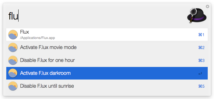 Controls F.lux using AppleScript, allowing you to switch color effects - Darkroom and Movie mode - or disable F.lux for one hour or until sunrise, with a few keystrokes.