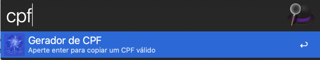 This Workflow generates a valid Brazilian CPF number (Cadastro de Pessoas Físicas). To use just type "cpf" and press enter. The CPF number will be copied to clipboard.