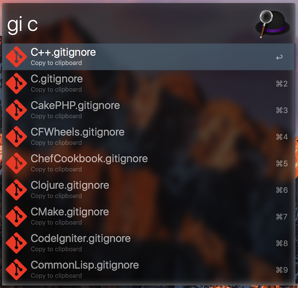 Easy get git ignore (base on GitHub gitignore) from Alfred workflow