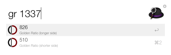 Use the keyword 'gr' followed by an integer to get the corresponding shorter and longer side of the golden ratio which then can be selected and copied to the clipboard pressing 'Enter'.