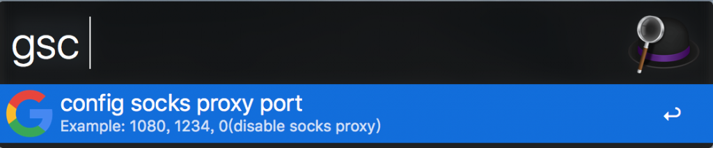 • Launch Alfred and type gsc to configure your local socks proxy port.
