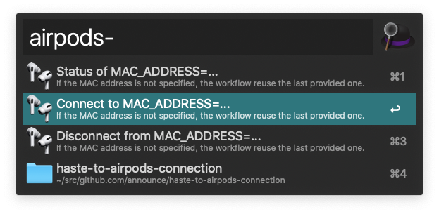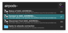 airpods-on Alfred. You need to specify the MAC address so that the workflow will remember the one for later use. For instance, the MAC address would look like00-03-93-a1-01-01.