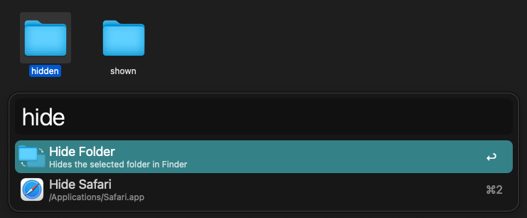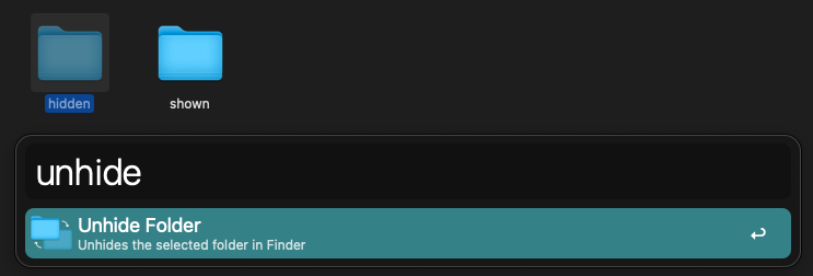 In order to unhide the folder again, you first have to select the hidden folder. In order to do so, press the keyboard shortcut "Cmd + Shift + ." while in a finder window to show hidden folders (the hidden folders will look translucent). Then select a hidden folder and type the keyword 'unhide' into Alfred. If you don't want to see the hidden files after that, just use the same shortcut as above to hide them again.