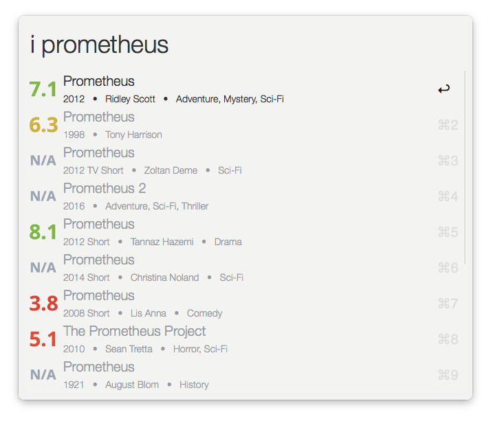 Search IMDb in Alfred with movie and TV show ratings shown as results' icons.