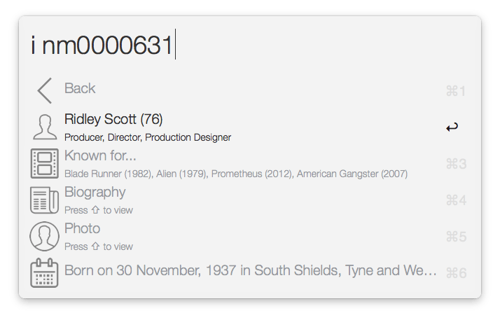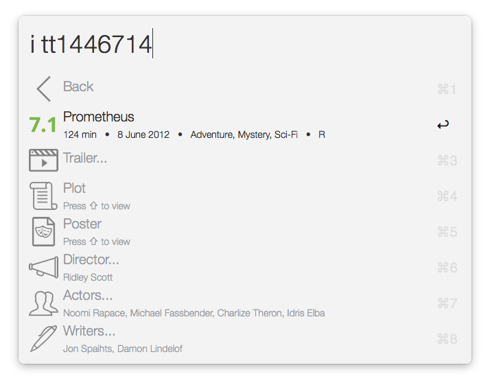 - Items with “Press ⇧ to view” in their subtitles (Plot and Poster for movies and Biograghy and Photo for persons) can be viewed right in Alfred: Press Shift (the Quick Look feature must be enabled in Alfred's preferences) to Quick Look them