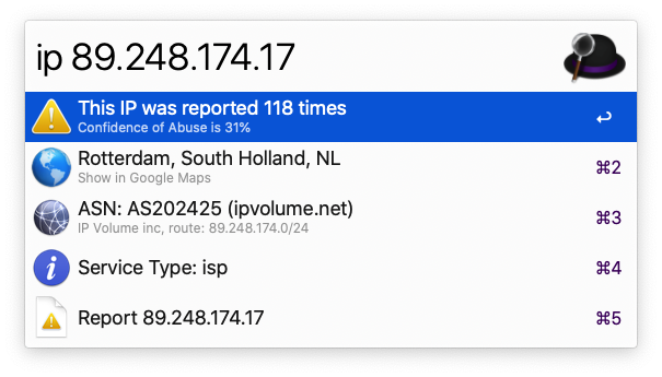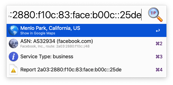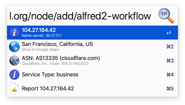 IP Tool can query IPs (both IPv4 and IPv6), domain names, URLs and any strings contain a URL. Alfred v3 and later versions required.