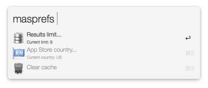 The workflow's preferences (keyword — masprefs) allow you to set the maximum search results limit and preferred store country, as well as clear the artwork cache.