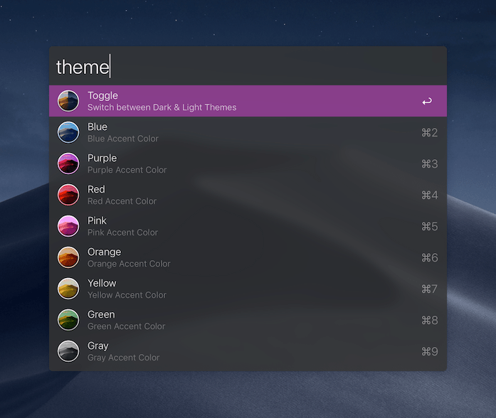 It allows you to select your Alfred's theme accent color and switch between Dark & Light modes. Here are the main commands :