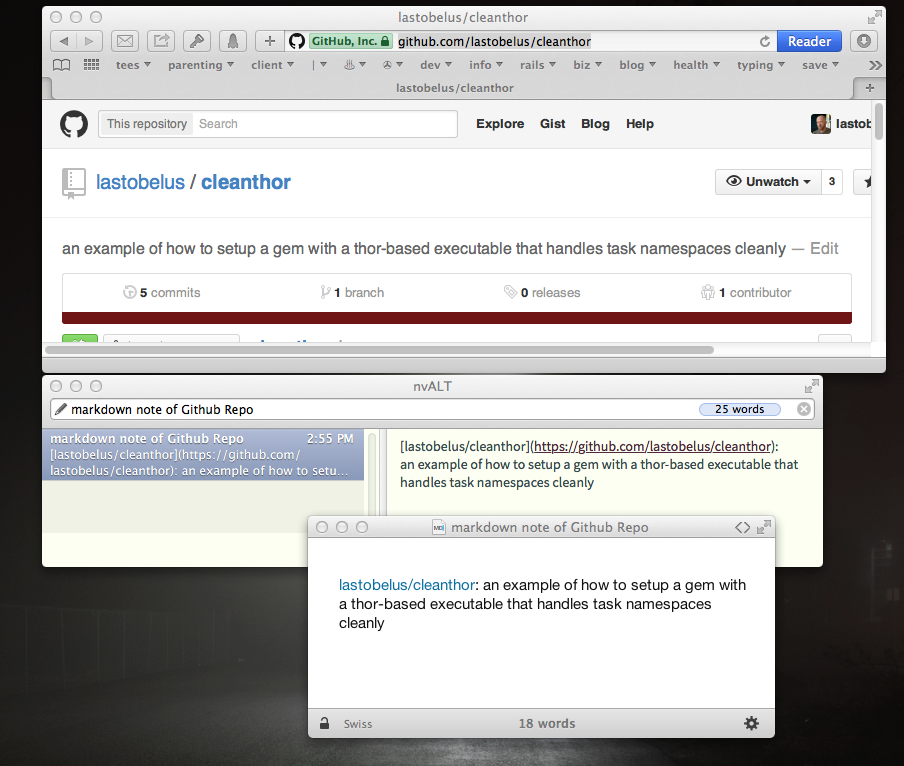 This workflow will create a markdown formatted note about a github repo in the frontmost browser window.