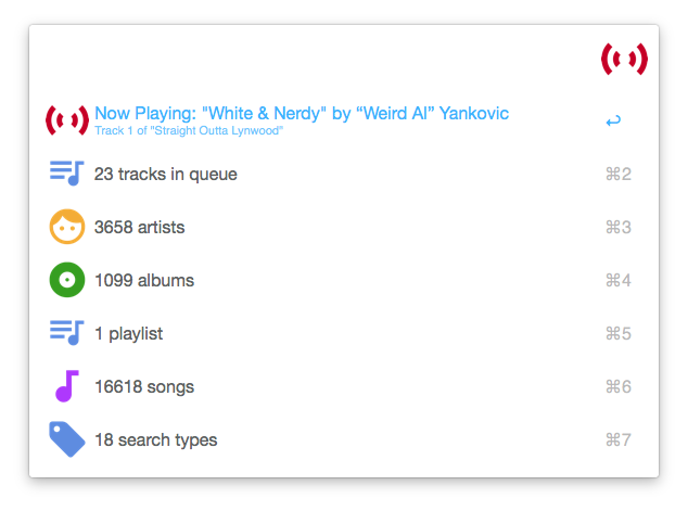 • , or ⌘+<NUM> — Search within albums/artists/playlists/types