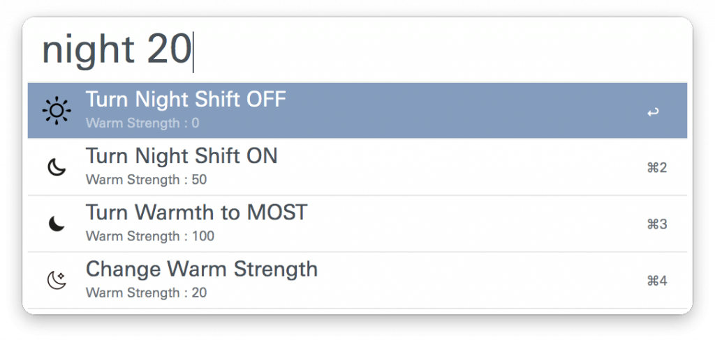 Toggle System Night Shift on/off or change warm strength quickly. Need macOS 10.12.3 and above.