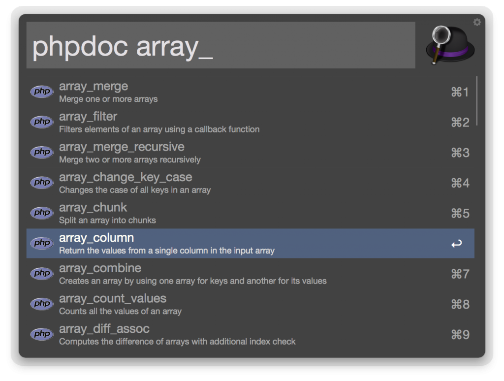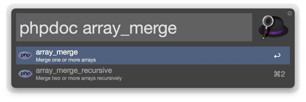 Emulates the php.net search field in Alfred by providing real-time search results for PHP functions, classes, etc. and linking to their doc page on php.net. The full result set for the php.net search field is stored locally and updates daily at the first use. Queries are case sensitive for more precise filtering.