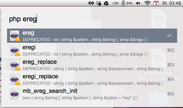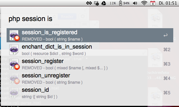 You can see the best results at the top, and some results, which could be interesting with a lower opacity. Removed PHP functions gets a red cross and deprecated functions an exclemation mark sign.