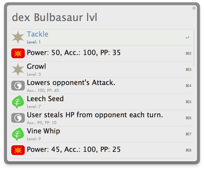 Features: - Works offline. - Pokémon Info: + Types Example: "dex bulbasaur" Pro tip: Press Enter on the Pokémon type to use Super Effective! workflow and check the effectiveness of your attacks. + Moves learnt by Level up Example: "dex bulbasaur lvl" + Moves learnt by TM Example: "dex bulbasaur tm" + Moves learnt by HM Example: "dex bulbasaur hm"