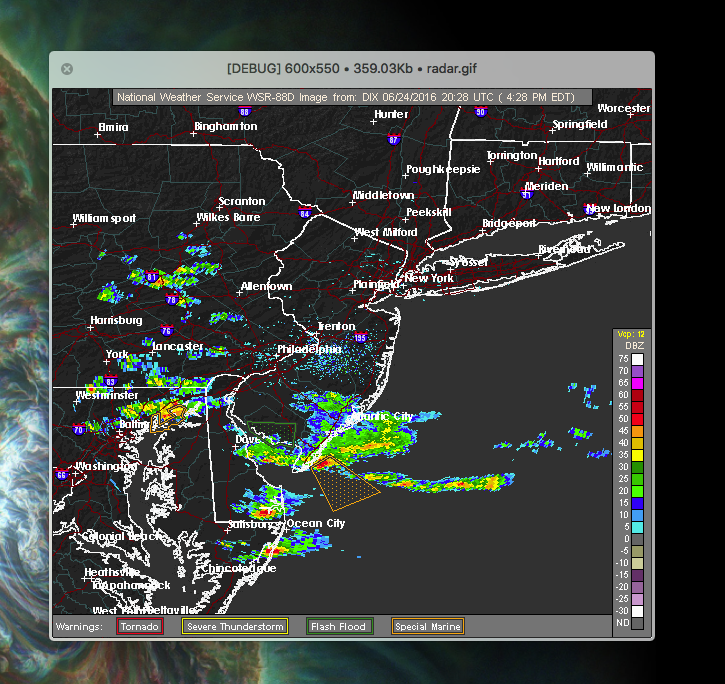 This workflow uses NOAA's servers so it only works for North America. My deepest apologies to people of other countries but I couldn't find a free, fast, global radar source that is also easily hackable. Note that these radar images are base reflectivity so when there is no rain there will be a lot of noise near the center. Weather channels typically filter this out but just look at the legend and it's easy to tell what's what.