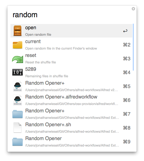 To run just type "random open" in Alfred bar. A random file within the given directory will be open and will not be randomly selected unless every other file has been opened.