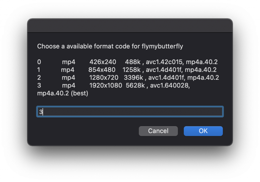 NOTE: When selecting video quality enter ONLY the format integer value, not the whole string listed. See screenshot of dialog below
