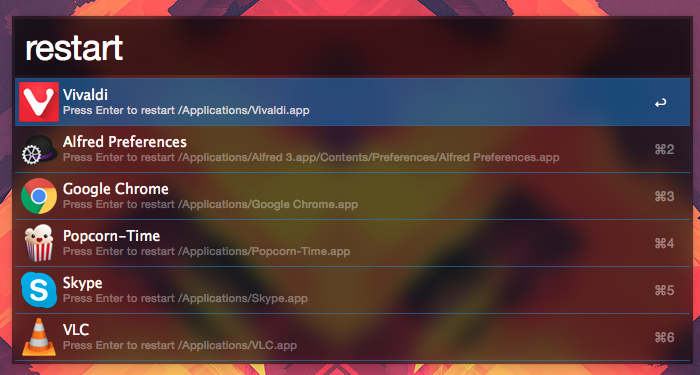 - Click any of apps from the Alfred's search that shown in Restart App result in order to restart/relaunch an app directly from Alfred.