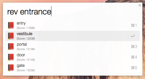 The Reverse Dictionary Alfred workflow can help. It lets you query the OneLookup reverse dictionary directly from Alfred, rapidly transforming your entrance into a vestibule.