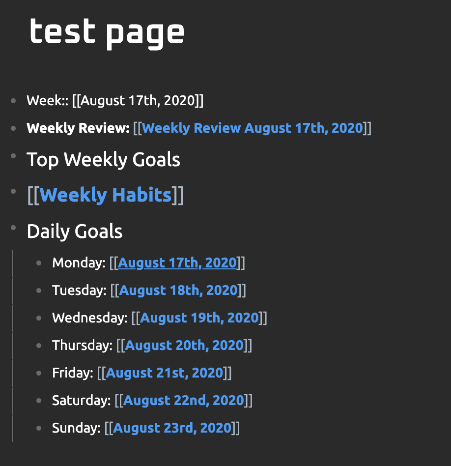 This workflow allows you to use a snippet trigger to generate a weekly plan template for the next week as described by Nat Eliason in his excellent Effortless Output with Roam course.