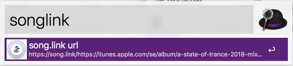 Share music links the friendly way using song.link to your friends (or enemies) whatever platform they are using and get direct links to the platforms supported by song.link. Use enter to open your selected platform link directly or use CMD-Enter to copy the link to your clipboard for sharing.