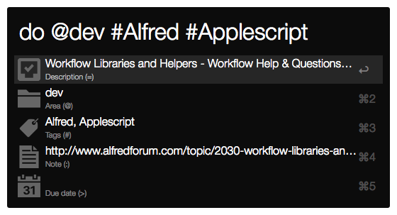 Features: - you can list as many tags as you wish - if no such area or project name exists the workflow will create an area on the given name - Someday and Today group names directs to do to Someday and Today lists - due date definition order is YYYYMMDD, without separators. You can also use two short forms: MMDD or DD. In case of short form the missing date part will filled from current date. - due date field is also able to do some basic math: if the first character is + or -, the following number will be used as day/week/month/year count. By default the workflow consider the number as days but you can alter this behavior by adding a “w”, “m” or “y” postfix character. So for example >+5w adds 5 weeks (35 days) to the current date as due date. - task description and task note fields are automatically filled if Safari was the frontmost application during workflow activation and also target area will set to “read later” by default. Of course you can override them.