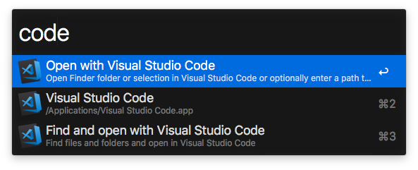An Alfred 3 workflow opening files or folders with Visual Studio Code.