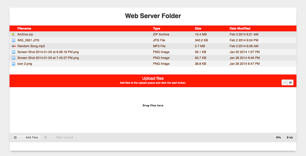 Update 1.3.2: - Upload feature revamped. Now you can Drag and Drop files and then upload [:D] You can even rename them before uploading. - It seems PHP has upload and memory limit. So uploading big files wasn't working. Hopefully everything works now. Or at least 2GB files.