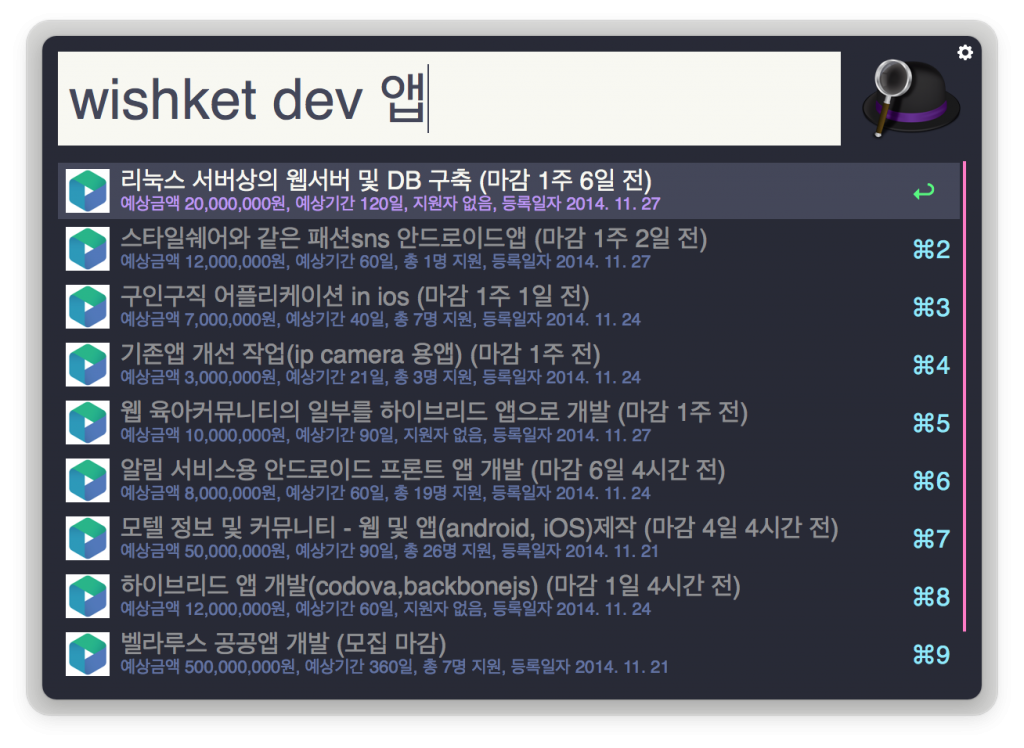 주요코드 : https://github.com/allieus/alfred2-wishket-workflow/blob/master/run.py