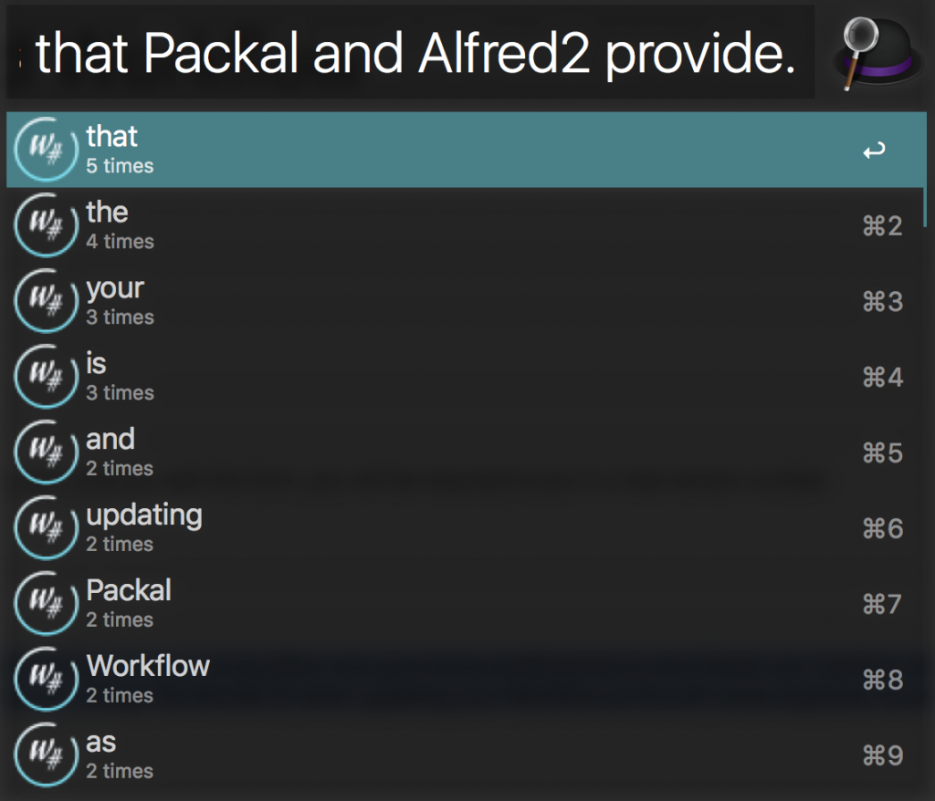 Type the keyword followed by the text you want to get statistics on and it will rank the words descending with the number of times it appears under the word. Selected word copies to clipboard.