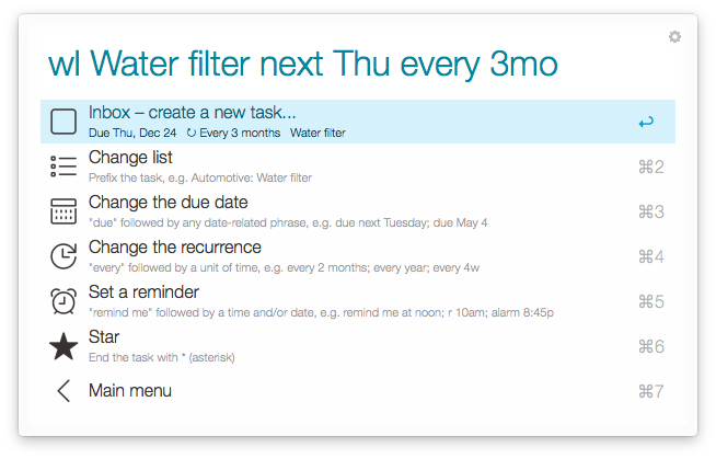 Use the menus to configure your task until you become a power user capable of typing everything manually. It's so worthwhile to be able to drop tasks into Wunderlist in under a second.
